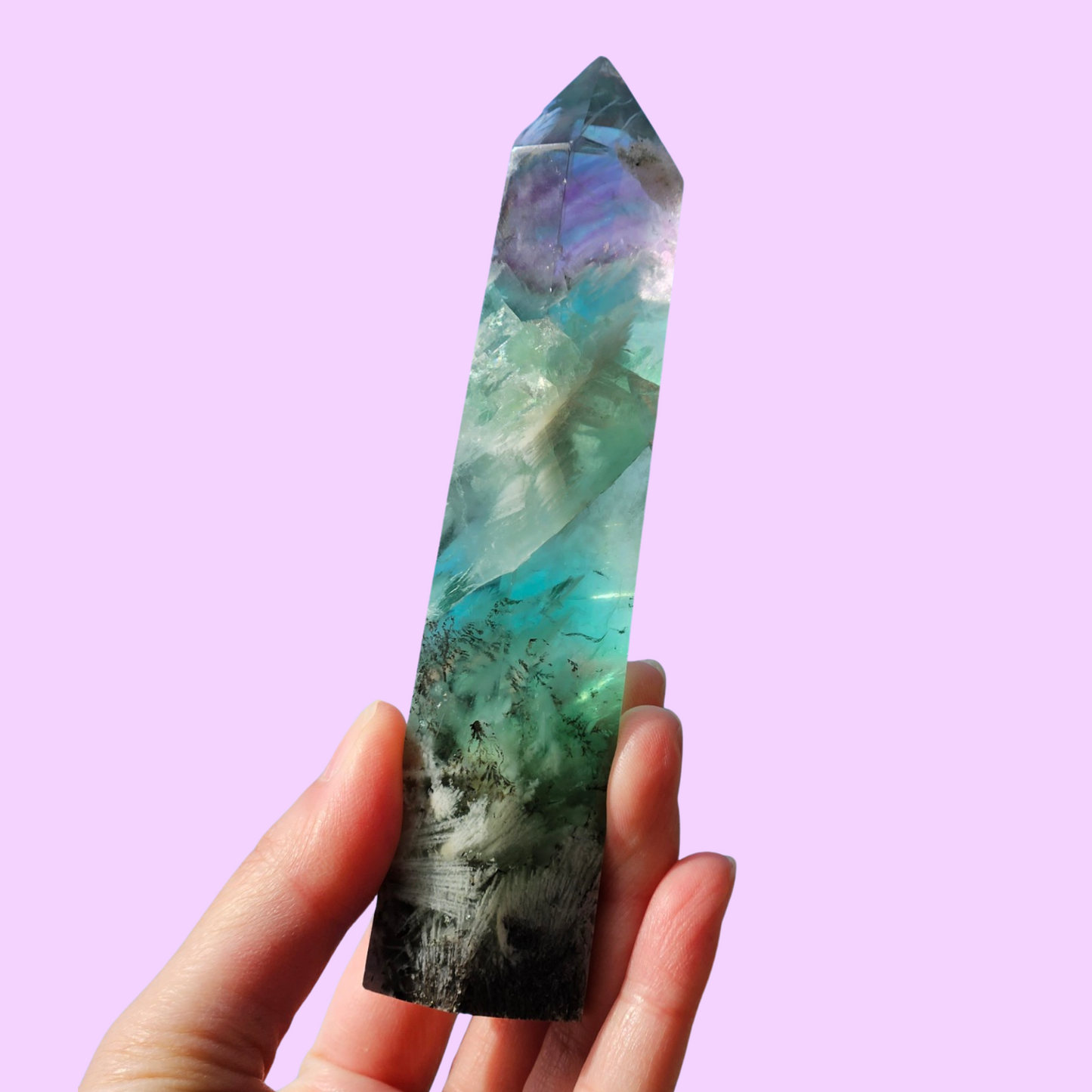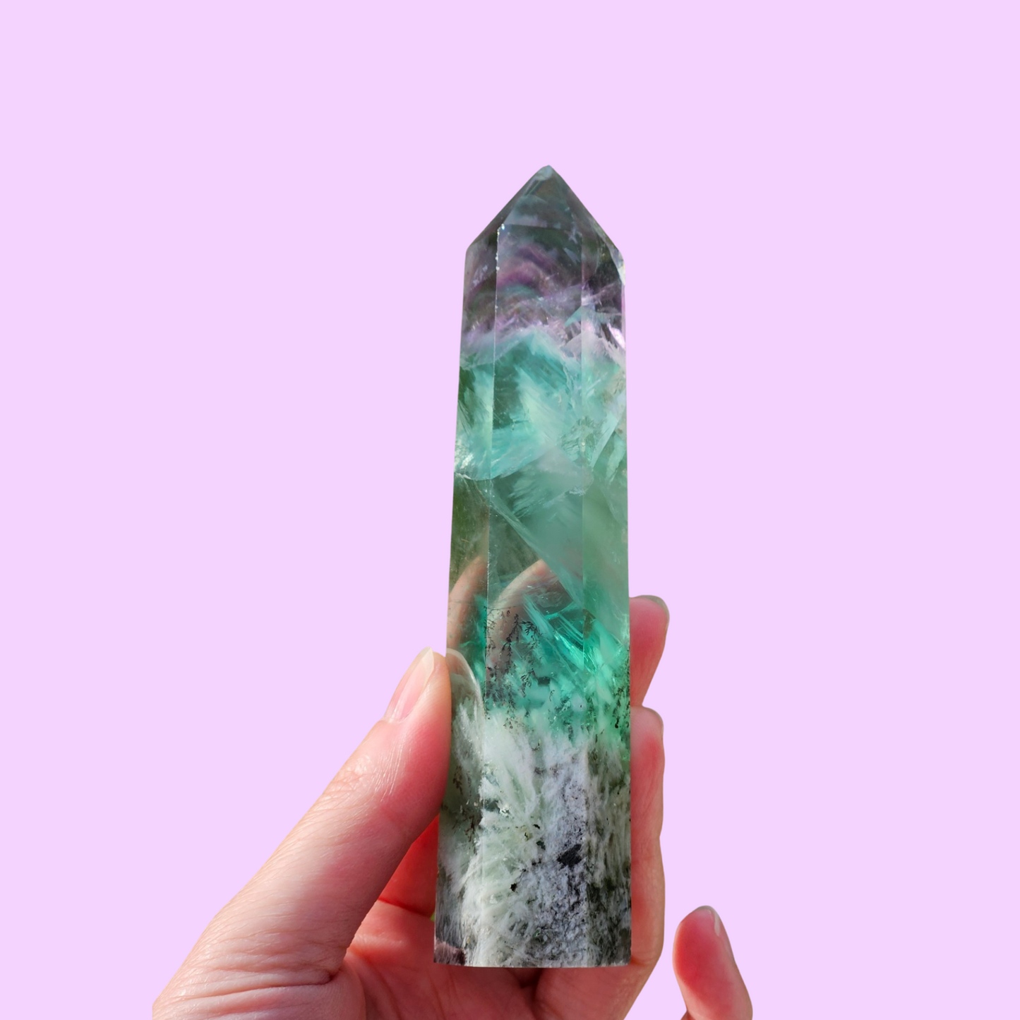 This dendritic fluorite point possesses a tranquil and calming essence. It initially targets the crown chakra before transitioning to stimulate the heart chakra.