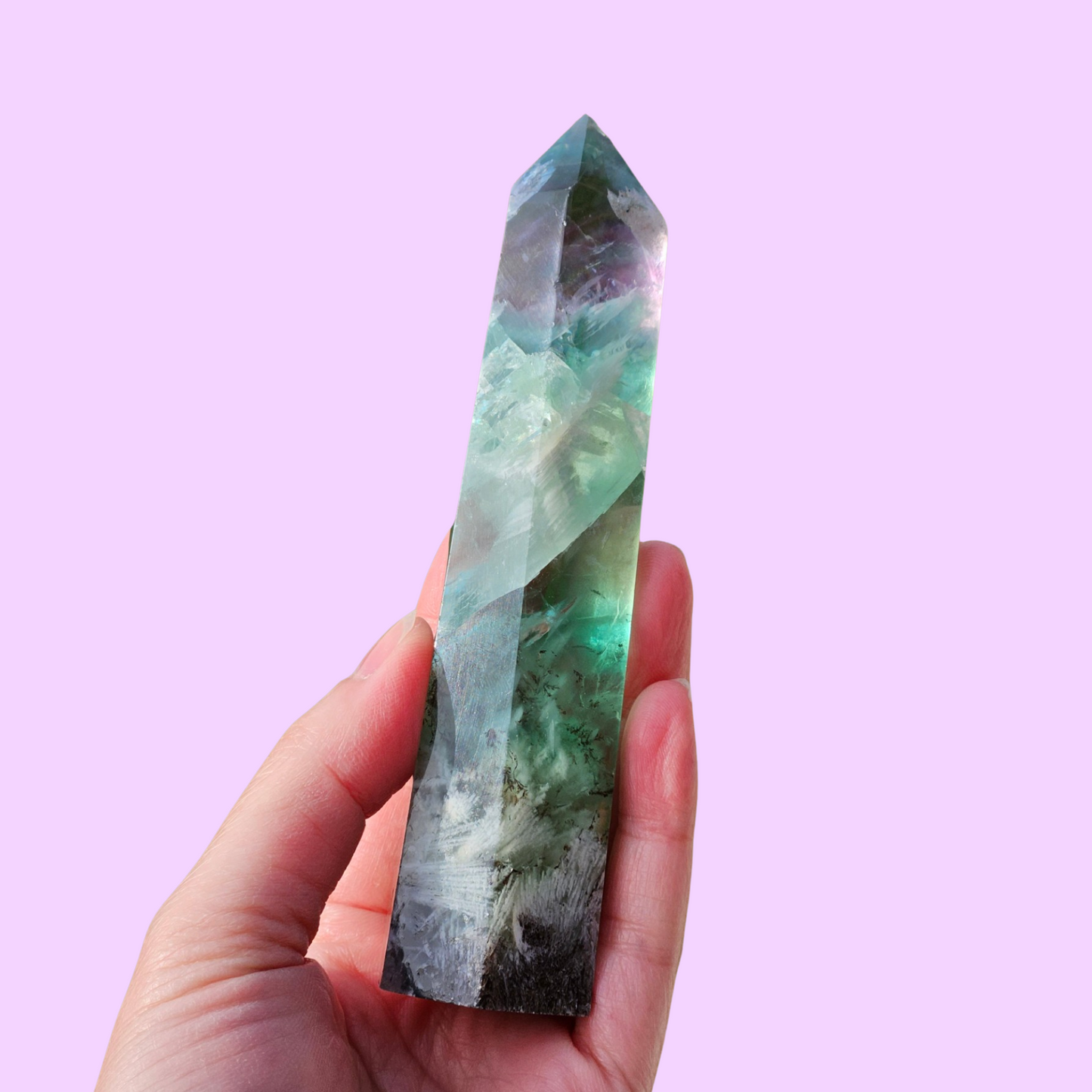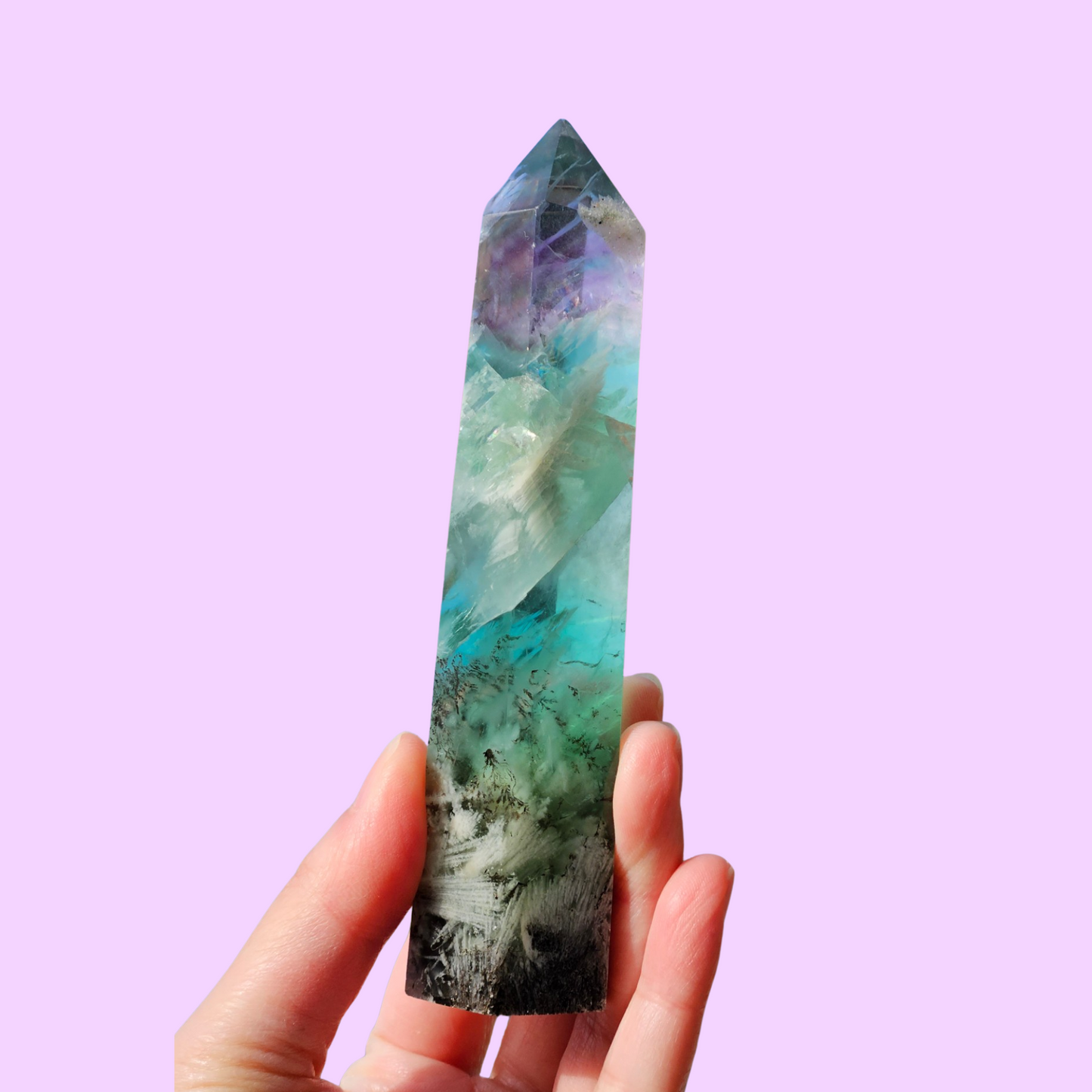 More Info: Sadly, this point has a slightly chipped point as shown in the photo. Fluorites are less hardy and chip more easily than quartz.