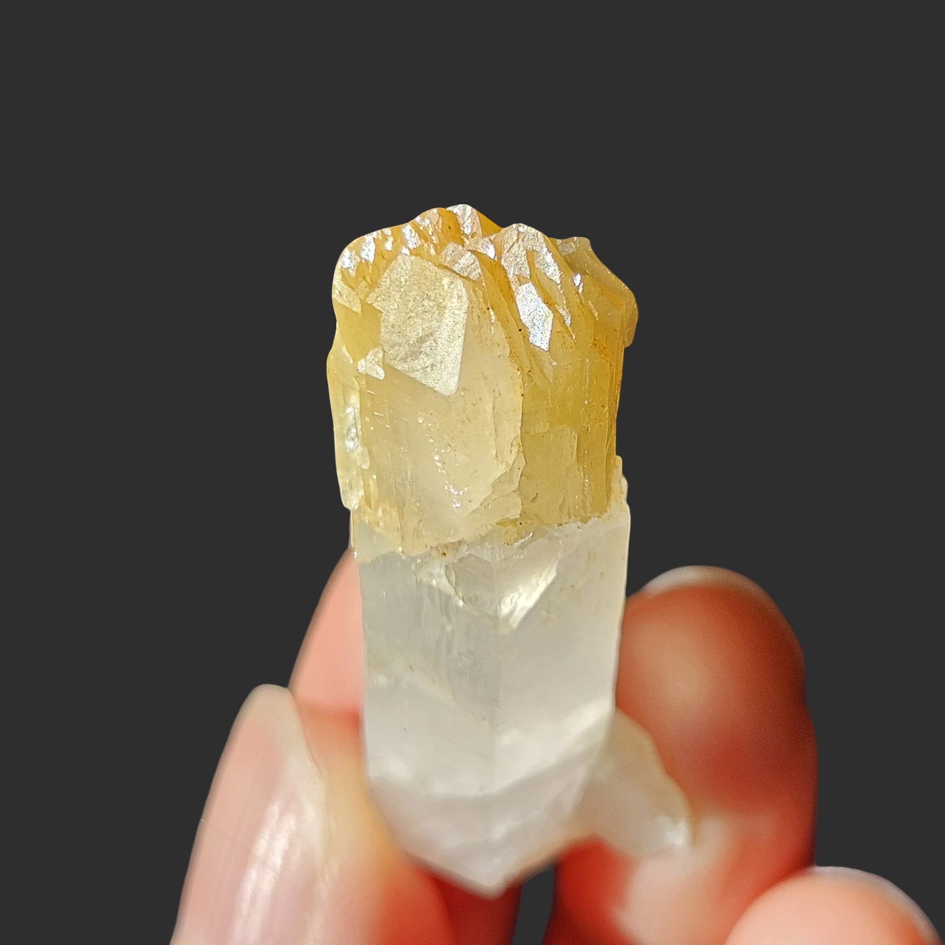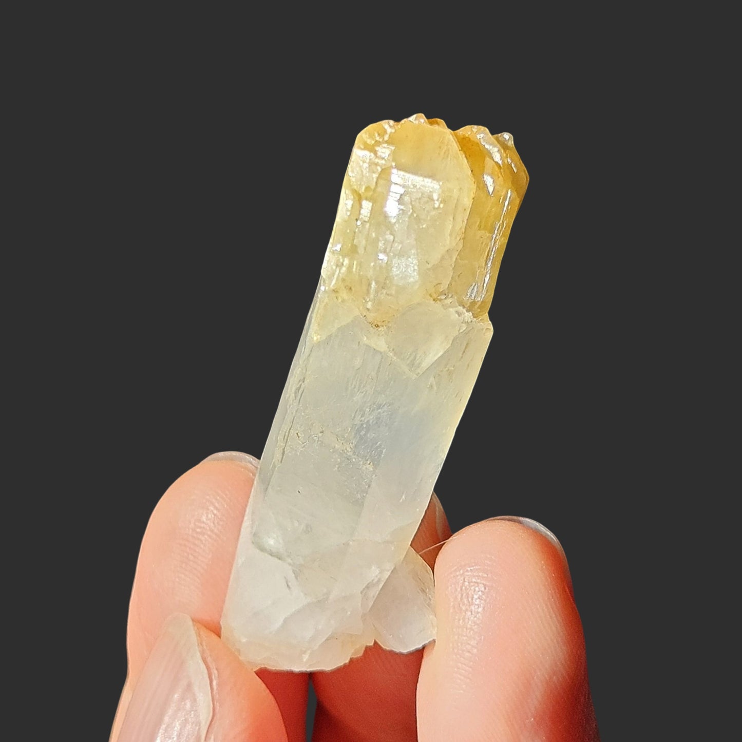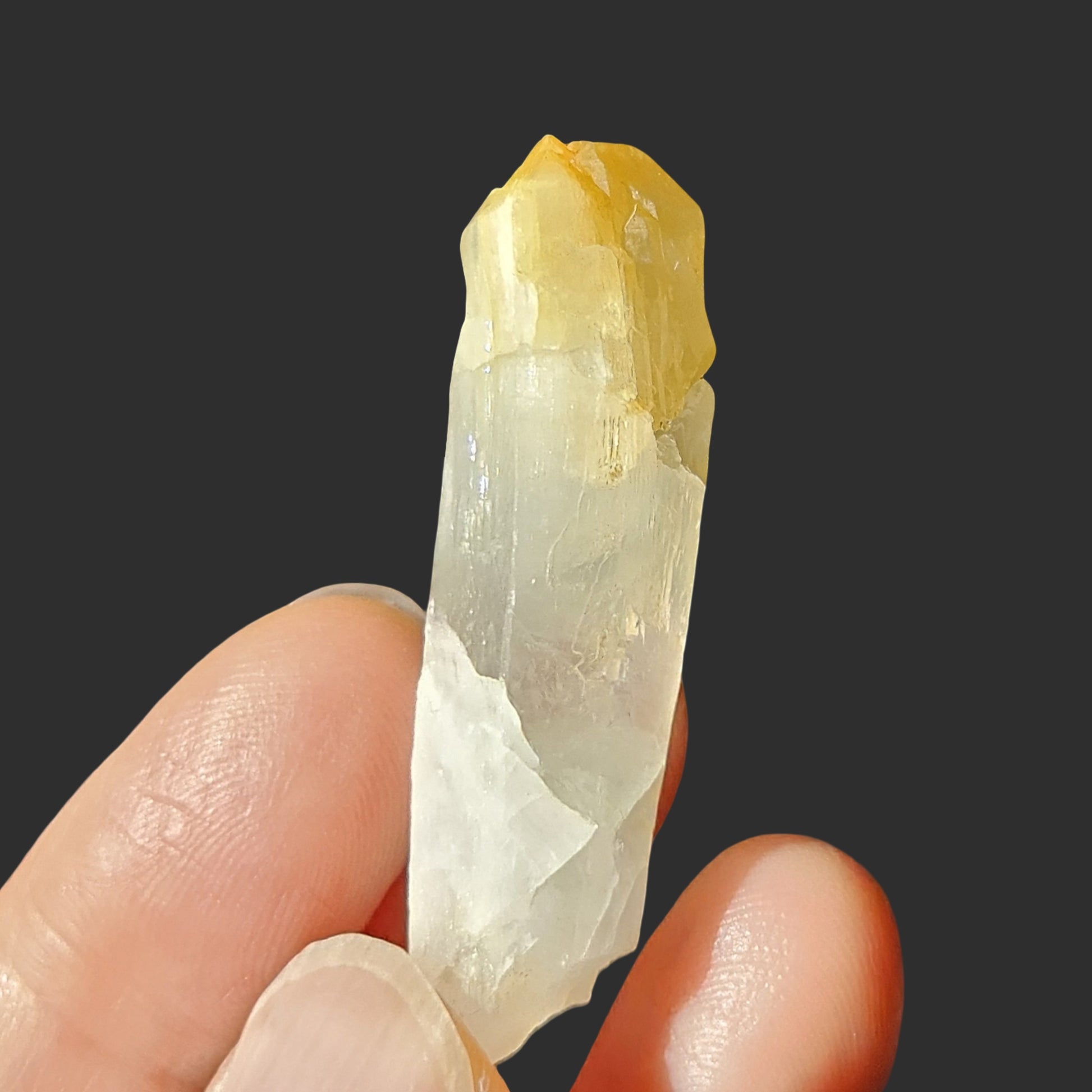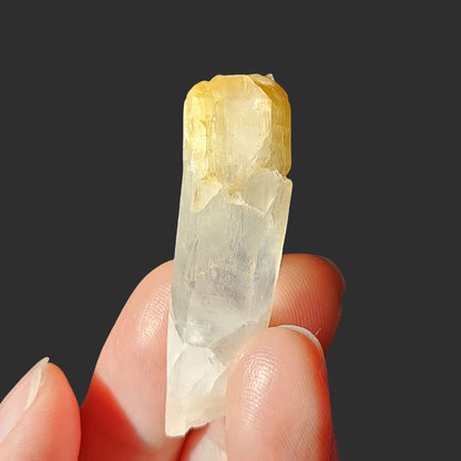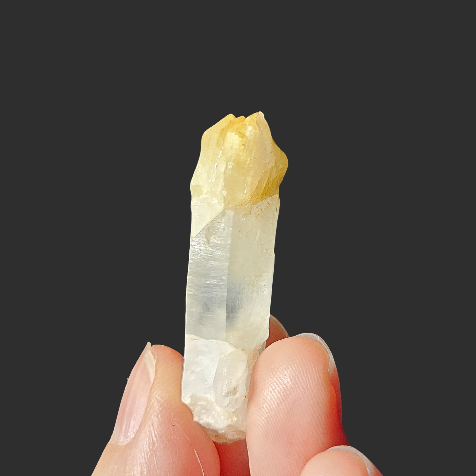 This rare Mango Quartz from Colombia features the classic golden-yellow tip, created by halloysite inclusions—a hallmark of this special variety. What makes this piece truly exceptional is its self-healed termination. During its formation, the crystal experienced damage and, in response, grew multiple new terminations at the tip—an extraordinary display of nature’s resilience and transformation.