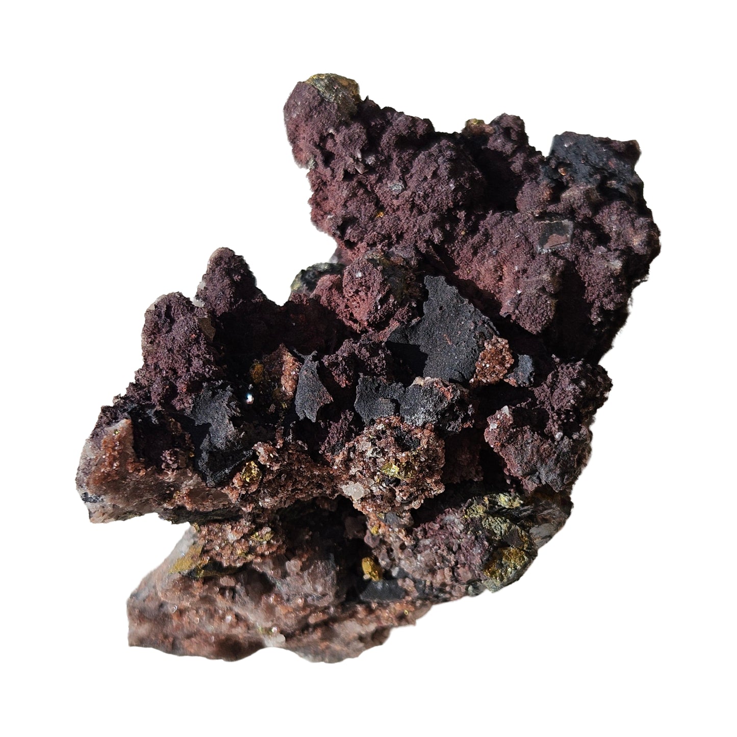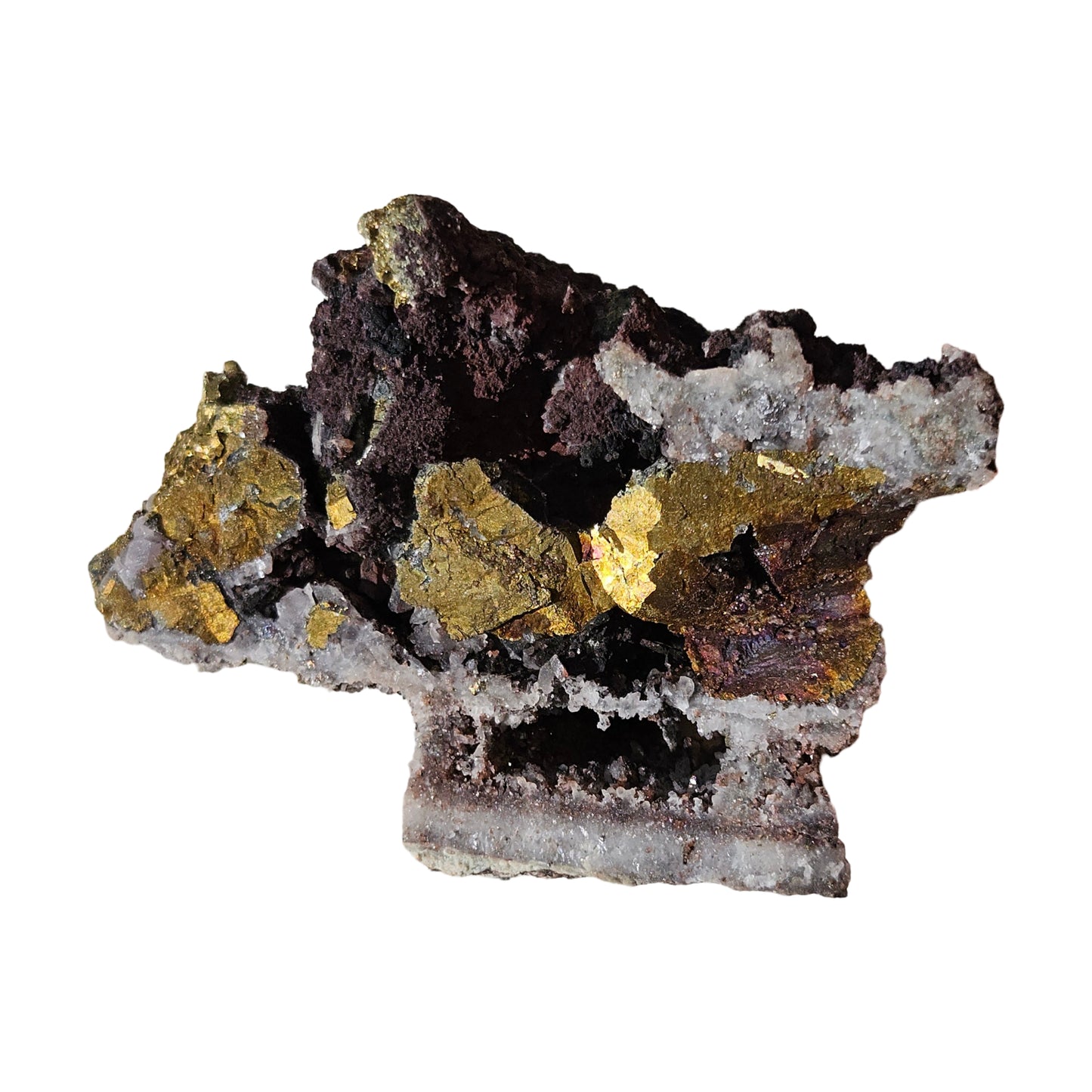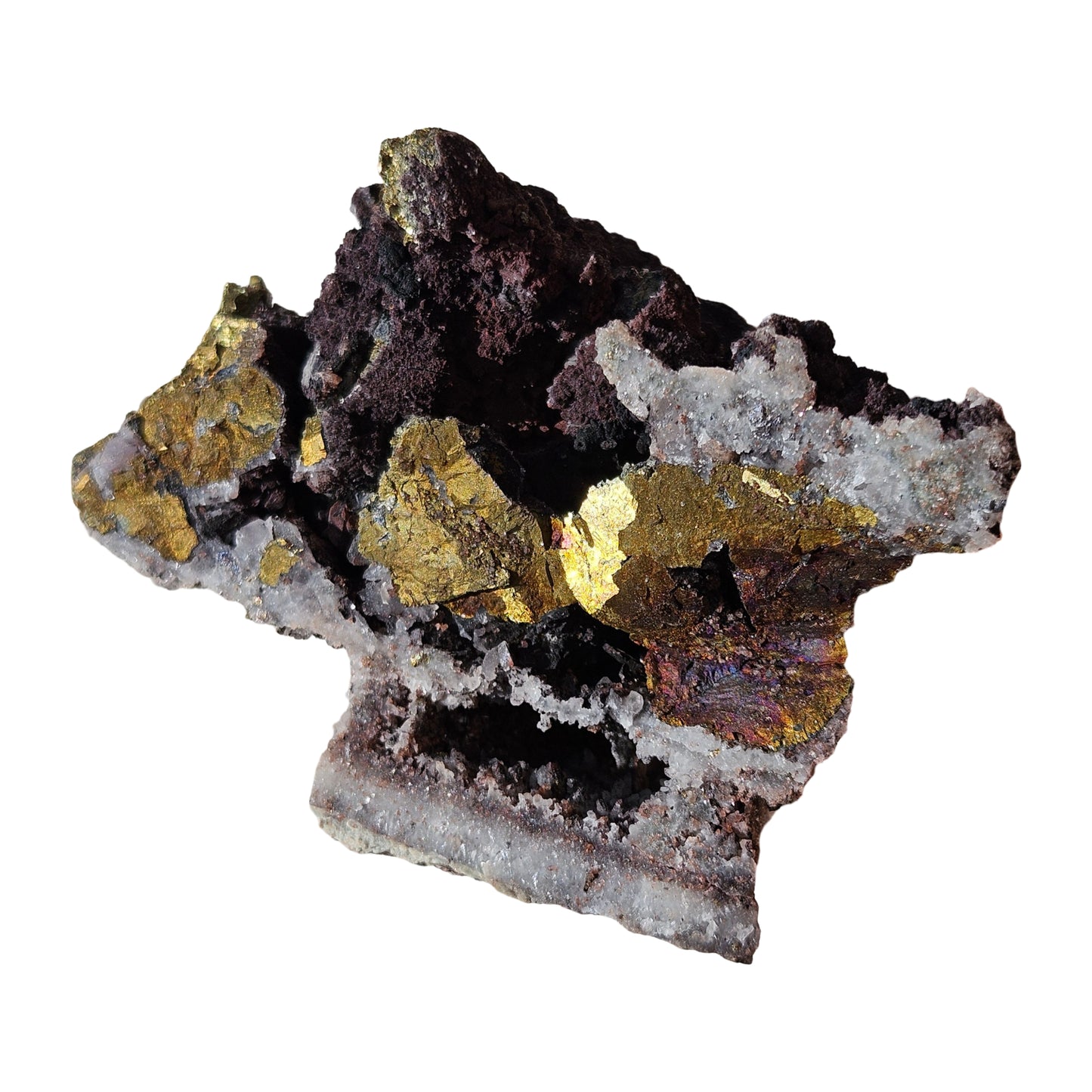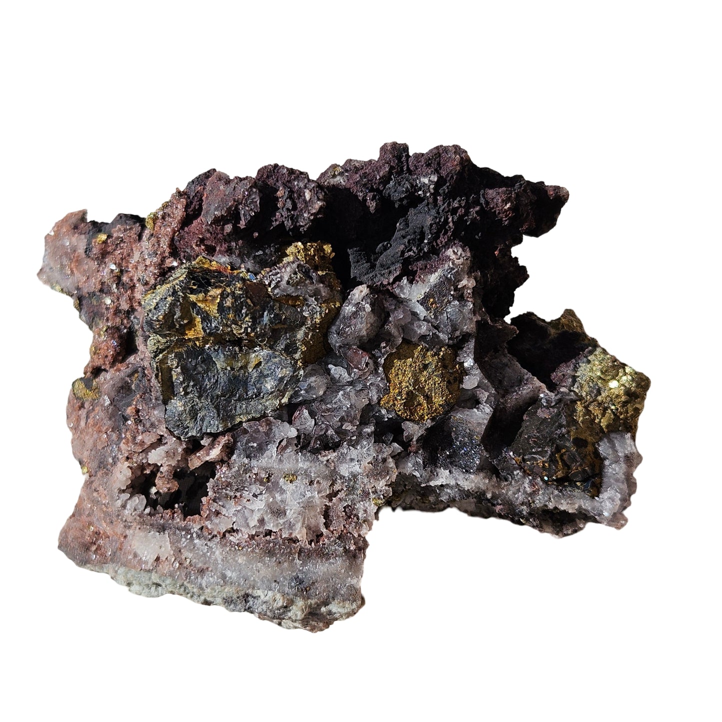 Very interesting Quartz with Limonite, Hematite, and Pyrite, specimen! I am not 100% certain of the minerals, but I believe the gold is pyrite (which is on its way to turning into limonite), with rainbow coloured limonite, black hematite crystals, and perhaps some sort of mica type mineral. The overall purple-red colouration is most probably hematite.