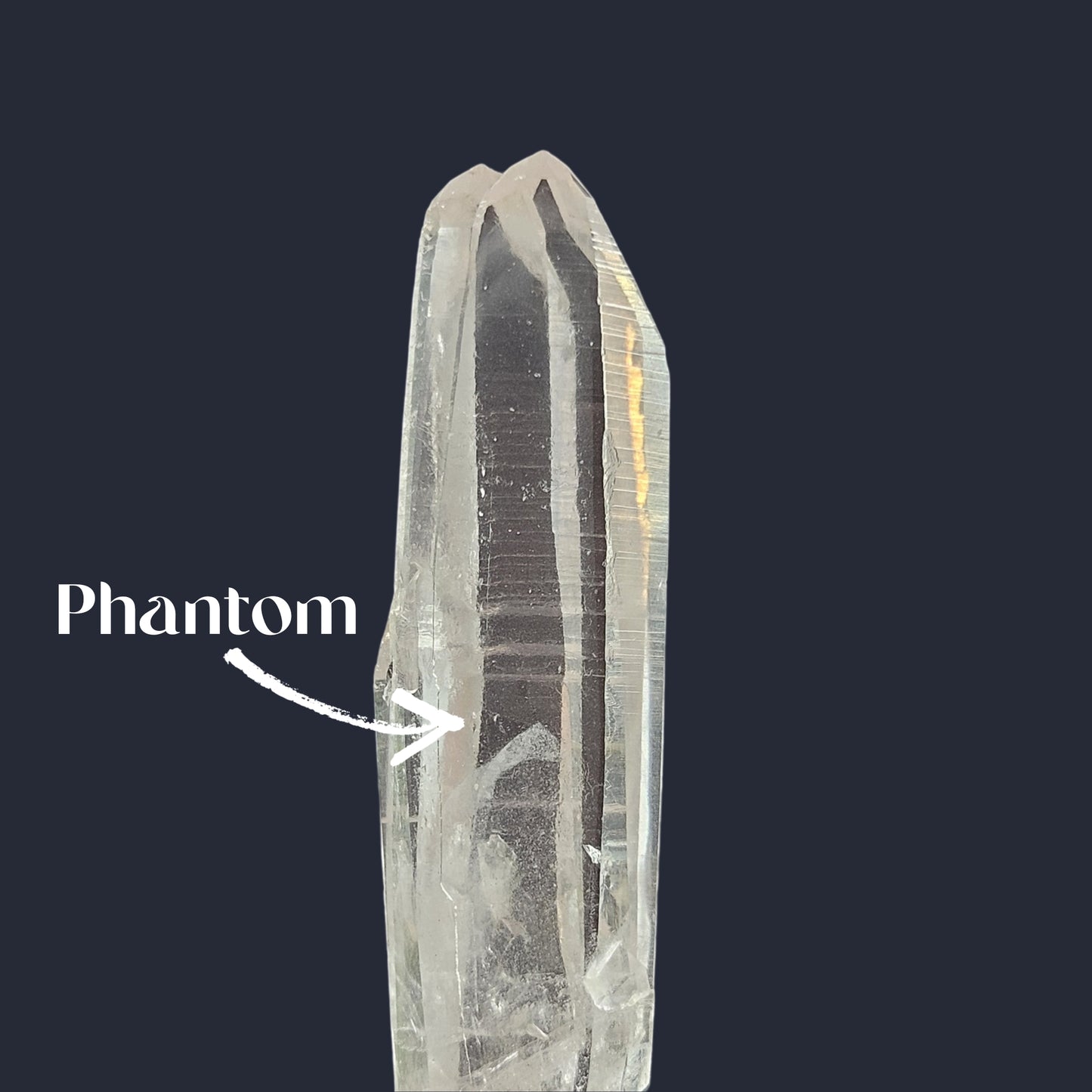 This twin, striated, double-terminated quartz is a rare and special find from Colombia. One of its terminations features a unique triple point formation and it also displays a white phantom.